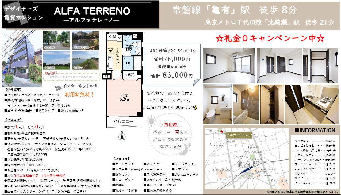 敷金: 1ヶ月/礼金: なし