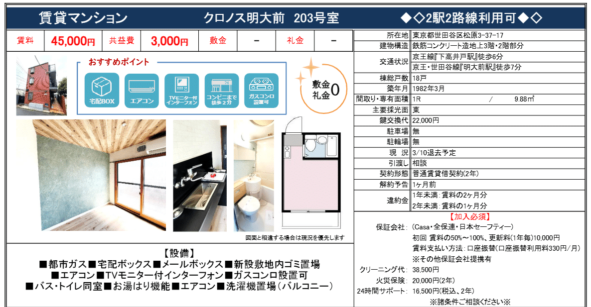 Description: 賃料: 4.5万円/共益費: 3,000円敷礼保敷金: なし/礼金: なし所在地東京都世田谷区松原3丁目37-17京王線 明大前駅 徒歩7分京王線 下高井戸駅 徒歩6分Show all description建築設備