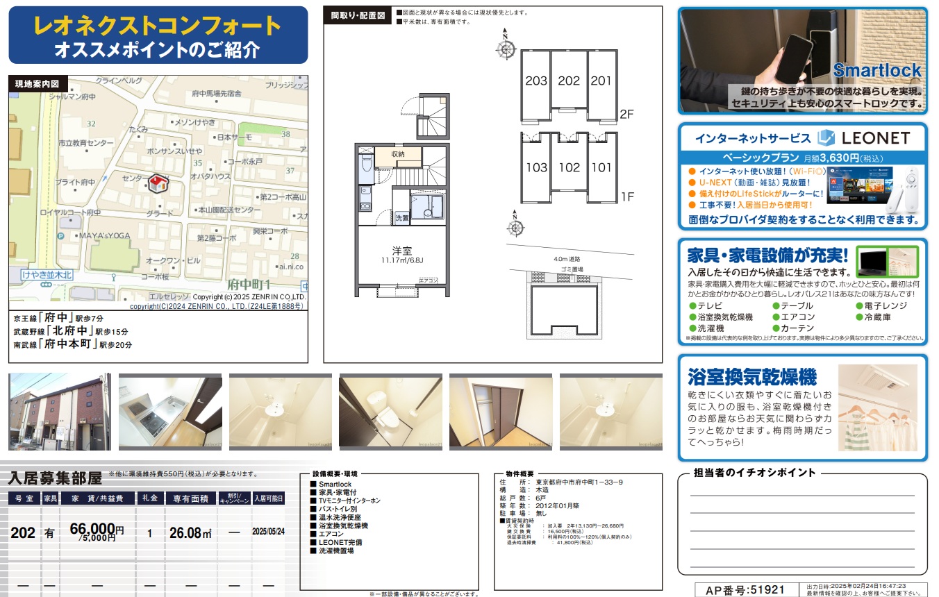| 設備 | 浴室廁所分開、浴室通風乾燥機、附家具及家電、LEONET(寬頻)、帶電視顯示器的對講機、溫水洗淨便座、城市煤氣、空調、2樓以上 | ||