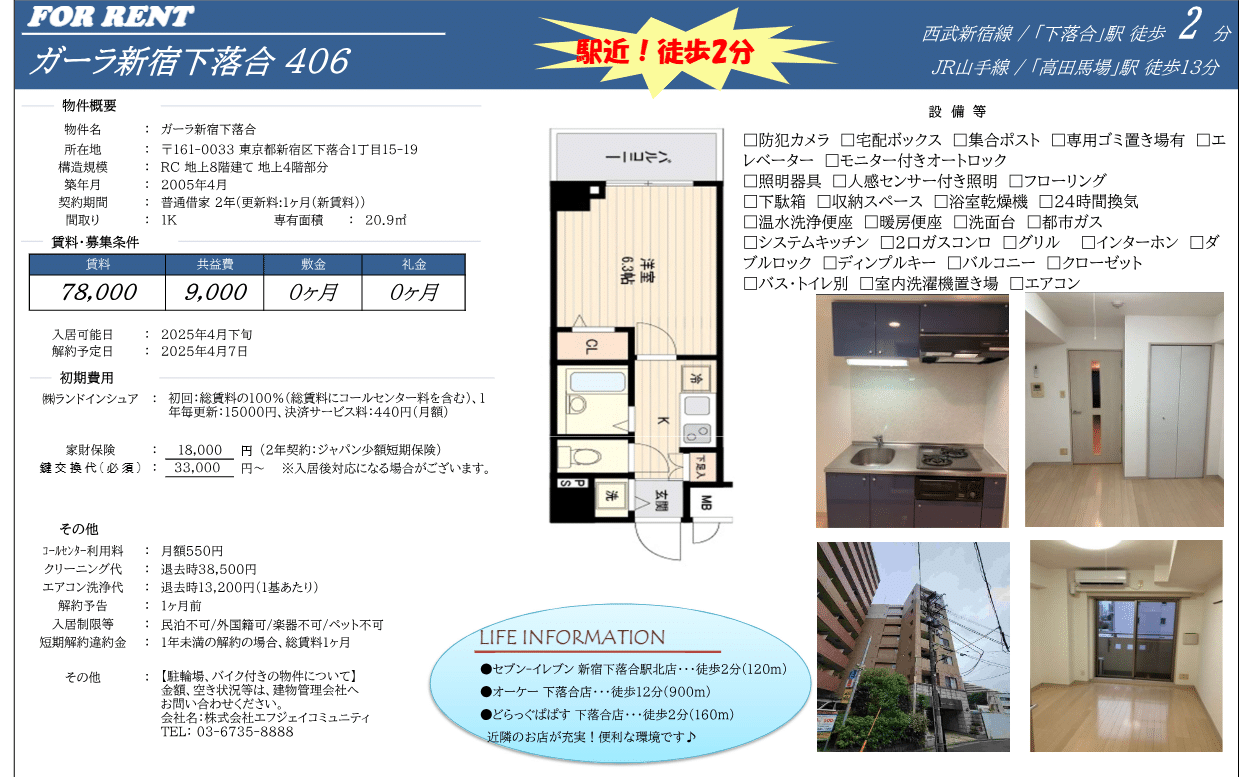 Description: 賃料: 7.8万円/共益費: 9,000円敷金: なし/礼金: なしShow all description交通:西武新宿線 下落合駅 徒歩2分JR山手線 高田馬場駅 徒歩13分建物設備電梯 / 自行車停放場 / 摩托車停放場 / 宅配箱 / 園區內垃圾堆放區