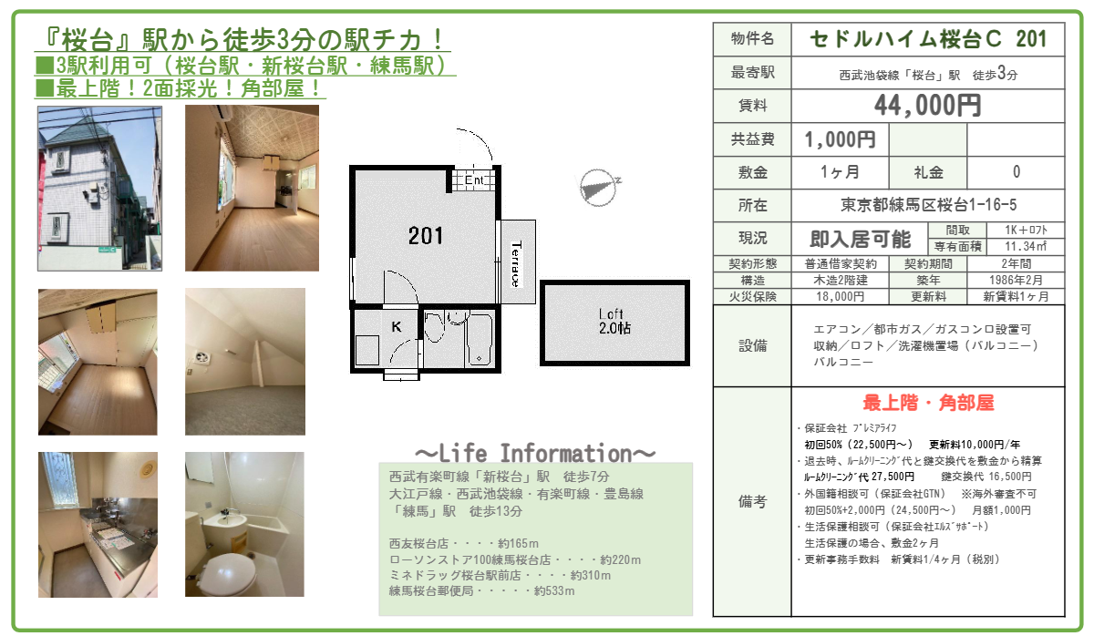 Description: 賃料: 4.4万円/管理費: なし/共益費: 1,000円敷金: 4.4万円/礼金: なし/保証金: なしShow all description交通:西武池袋線 桜台駅 徒歩3分西武有楽町線 新桜台駅 徒歩7分都営大江戸線 練馬駅 徒歩13分設備・詳細:洗衣機位置 / 閣樓 / 陽台 / 寧靜住宅區 / 角落房 / 頂樓