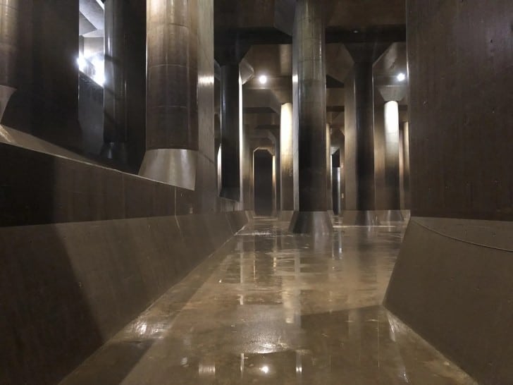 首都圏外郭放水路最著名的景點就是「調圧水槽」,這裡被譽為地下神殿般的空間,擁有壯觀的柱子和寬敞的設計。它不僅能減緩洪水流速,還成為許多遊客拍照打卡的絕佳地點!