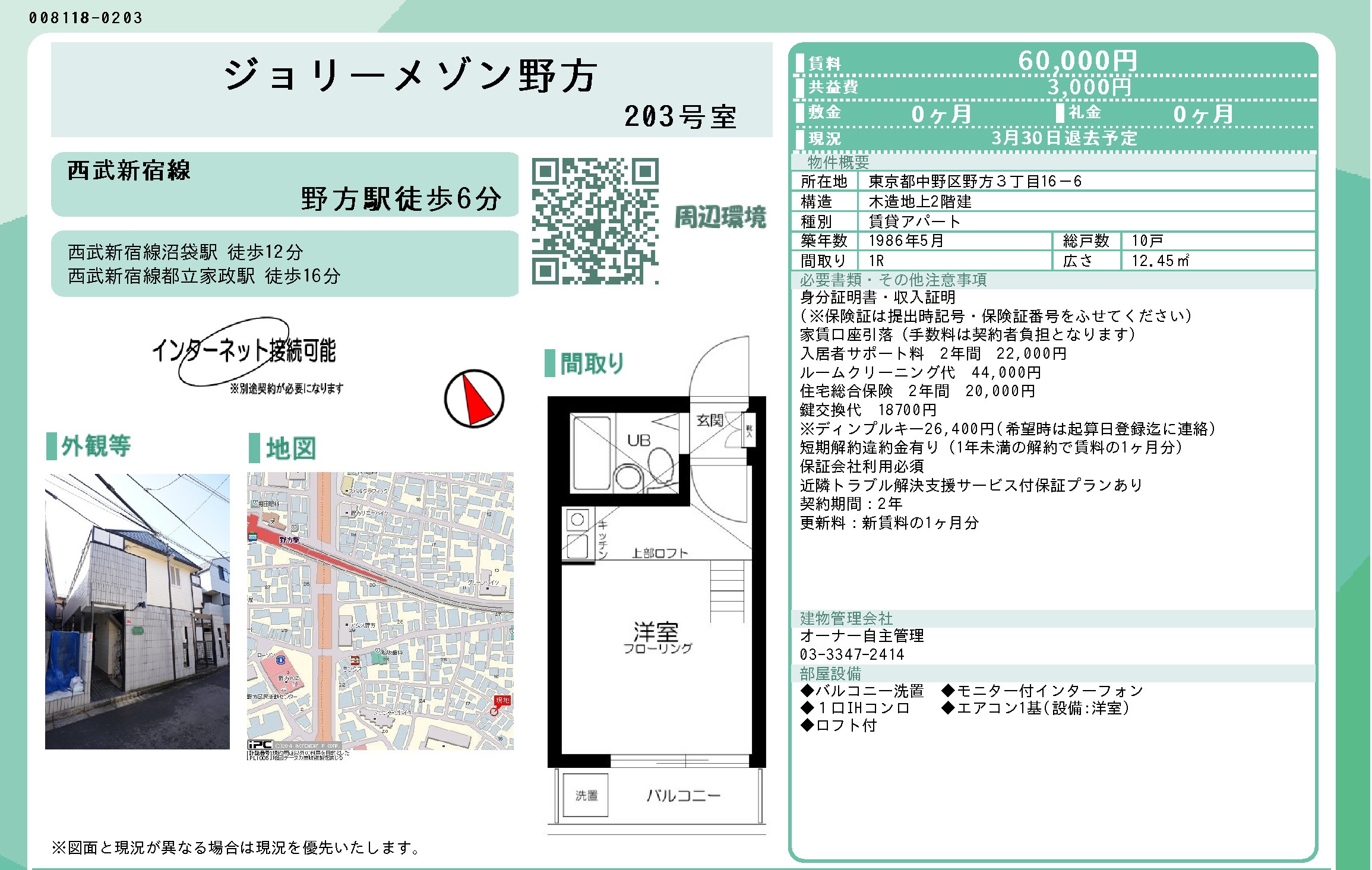 西武新宿線東京都中野區東京Nakano City165-0027日本〒165-0027 Tokyo, Nakano City, Nogata, 3-chōme−16−6 ジョリーメゾン野方